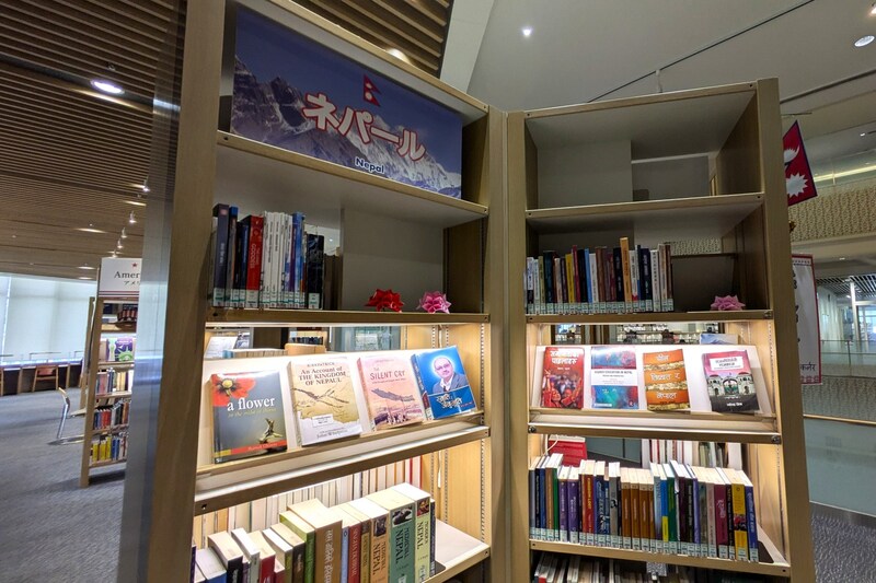 アメリカ情報コーナー、上海、ネパールなど、国ごとの文化を伝える本棚が並びます。大使館からの寄贈本もあるそうで、なかなか国内では手に取ることができない本も見られます。