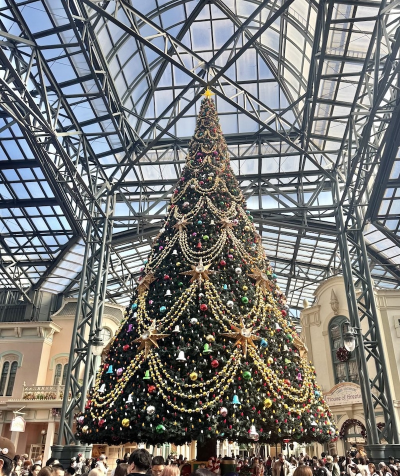 ディズニーランドのクリスマスといえば、ワールドバザール中央に飾られたクリスマスツリー。高さ約15メートルの華やかでキラキラのツリーは見ているだけで幸せな気持ちになります。
