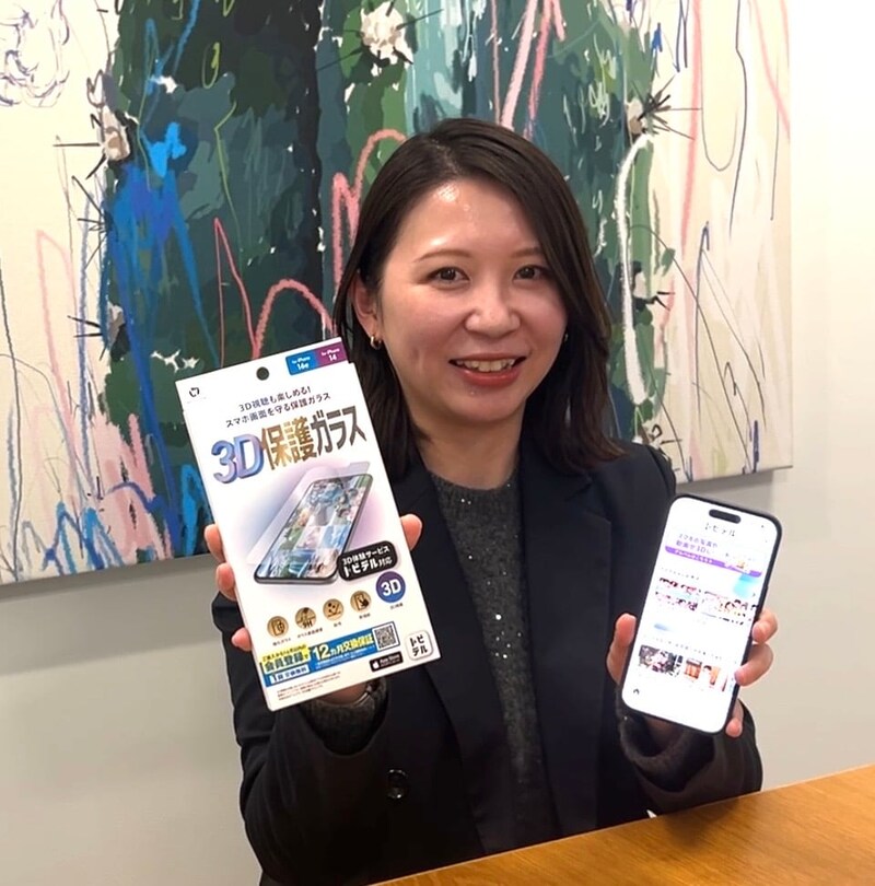 「トビデル」は、専用の保護ガラス(税込み7,200円※)をスマホに貼ると、「トビデル」アプリ(月額使用料:無料)で、スマホ内の写真や動画を、裸眼(3Dメガネなし)で、3Dで楽しめるサービスです。