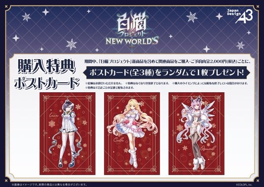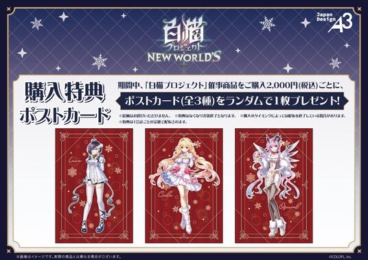 期間中に、「白猫プロジェクト」新商品を含めて関連商品をご購入・ご予約内金 2,000円(税込)ごとに、特典ポストカード(全3種)をランダムで1枚プレゼント!