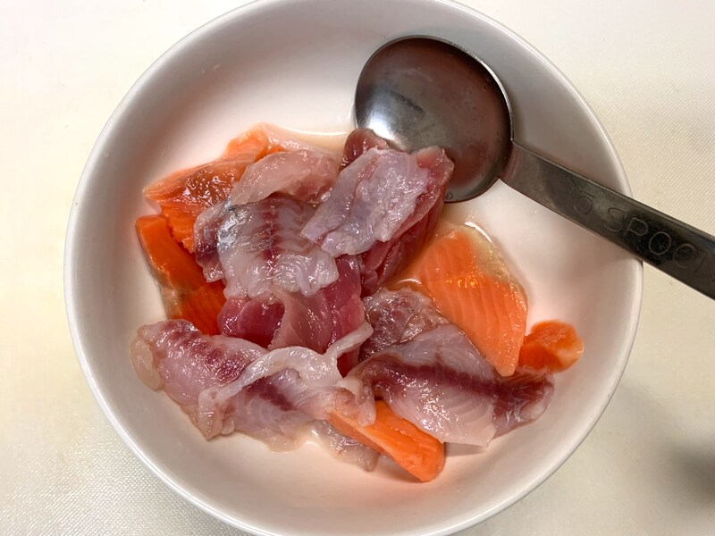 →新鮮なお刺身なので臭みはないと思いつつ、生臭みがあったら嫌なので一応臭み処理です。