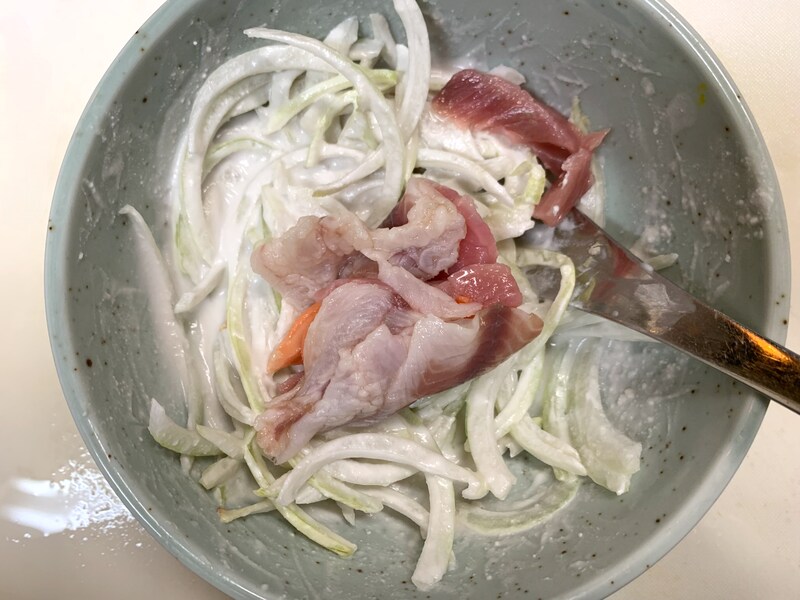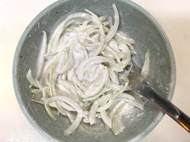 ④玉ねぎとココナッツミルクを和えます。