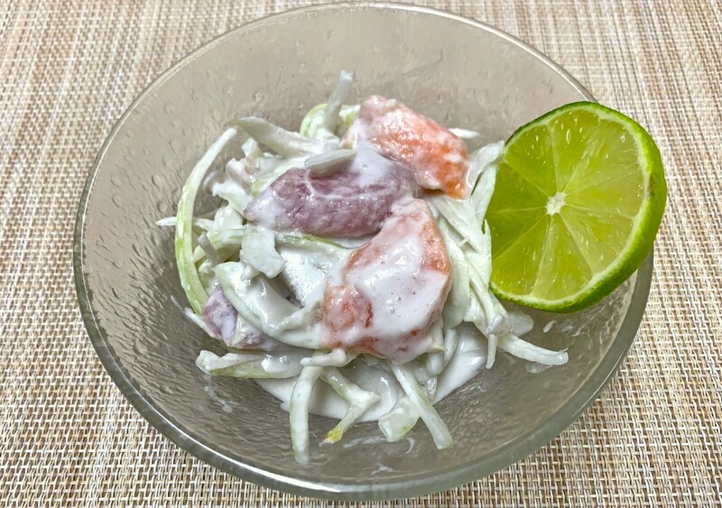 しかし玉ねぎをスライスに変えただけで、未知の食べのものが一気に見慣れたサラダ系の食べ物に変わるから不思議ですね。