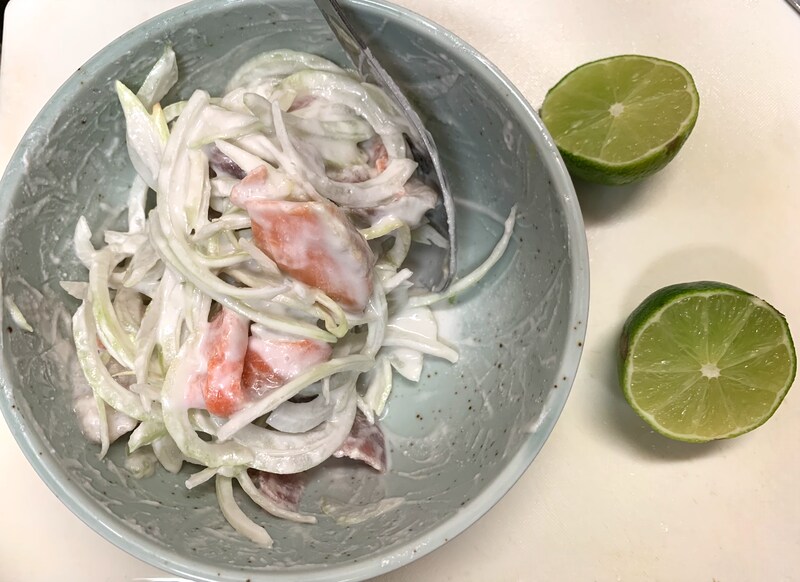 ⑤玉ねぎとココナッツミルクを混ぜ合わせたら、ライム漬けした刺身を投入して和えます。