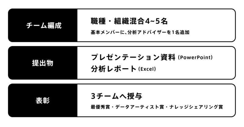 日々の業務に追われ、データに基づいた企画立案のプロセスに触れる機会がない社員もいるでしょう。そこで本コンペには、実務に近い形でデータドリブンなアプローチを「体感」してもらうことを意図して設計しました。一度でも成功体験を積むことが、文化浸透の何よりの近道だと考えたからです。