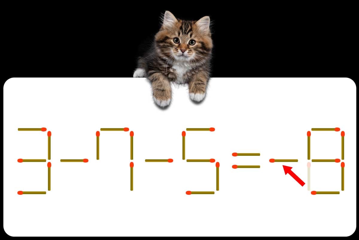 「8」のマッチ棒を1本、「=」の後ろに移動させて「-」を作り「3-7-5=-9」にする。※解答は複数ある場合があります。