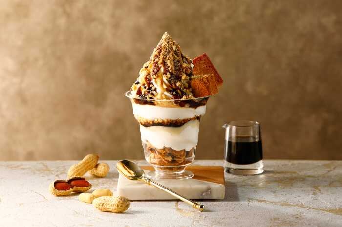 2025年10月1日(水)より発売される「ドレ・黒蜜きなこサンデー」(880円/税込)。ミルクソフトクリームに黒蜜ときなこの風味を重ね、八街産ピーナッツを使ったトッピングで仕上げました。