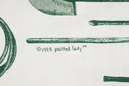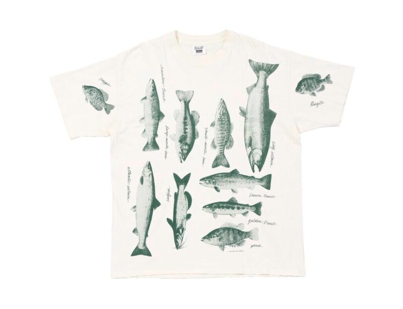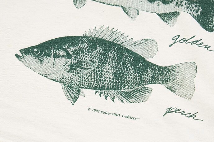 「painted lady」で1993年には存在する魚の総柄。こちらは翌年に「rel・e・vant products」のブランド名のコピーライトとなって作られた。リアルで様々な種類の魚が描かれ、それぞれに名称も入るので勉強にもなる。1万2000円(デザートスノー ガーデン店TEL03-5761-6390)