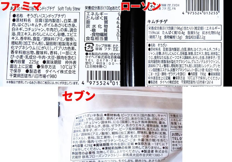 製造元を調べると、ファミリーマートとローソンはどちらも「タイヘイ」、セブン-イレブンは「武蔵野」とそれぞれ異なるメーカーでした。さらに、調理方法もファミリーマートとローソンは電子レンジ調理に対応している一方、セブン-イレブンのみ鍋で煮込むタイプです。