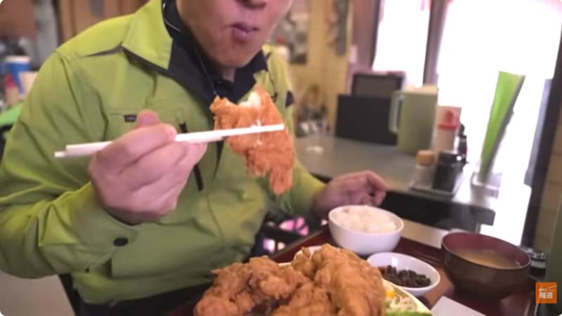 午前11時半、オープン時間になると、店内はあっという間に満席に。初来店という男性がオーダーしたのは、もちろんから揚げ定食。「この量はちょっと予想外」とボリュームに驚きながらも、「鶏がめちゃくちゃ柔らかい。衣もサクサクしてます」とそのおいしさに夢中です。