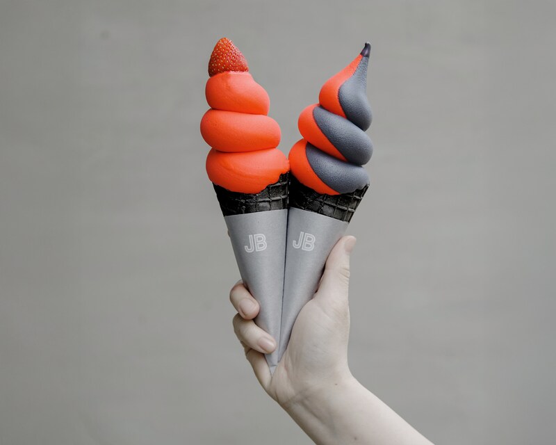 店内では、北海道発の人気コーヒーブランド「MORIHICO.」が手掛ける「JBソフトクリーム」を提供しています。看板メニューは、伏見稲荷の“朱色”をイメージした「ブラック×ストロベリーミックス」。フレッシュなイチゴに、スペイン産のチョコレート3種をブレンドした濃厚なソフトクリームを重ね、竹炭を練り込んだコーンに盛り付けた一品です。