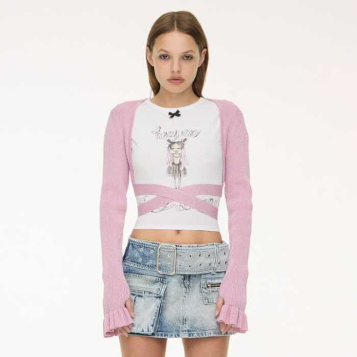 SANDY LIANGが手がけた「サンディーリアングスパークリーボレロ」は、バレエウェアを思わせるコンパクトシルエットに、繊細なリボンやラメを施したフェミニンな一枚。価格は30,800円。