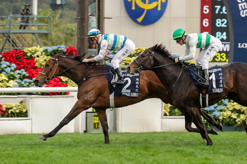 現地時間12月14日、香港・シャティン競馬場で行われた第7R・香港マイル(G1・3歳上・芝1600m・1着賞金2016万香港ドル=約4億円)でZ.パートン騎乗、ヴォイッジバブル(せん7・P.イウ)が勝利した。2着に日本馬のソウルラッシュ(牡7・栗東・池江泰寿)、3着にレッドライオン(せん6・J.サイズ)が入った。勝ちタイムは1:33.47(良)。