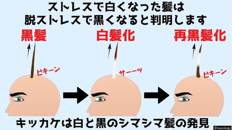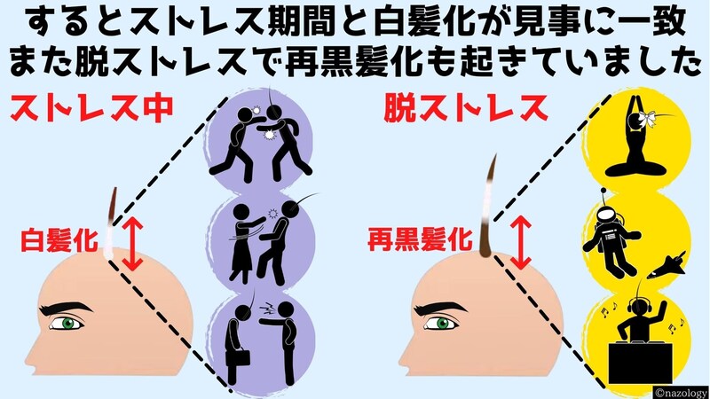 参加者の白髪化はストレスによって引き起こされ、色素化は脱ストレスによって起きていたのです。