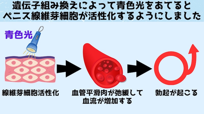 研究ではまず、オスマウスたちのペニスにある線維芽細胞の遺伝子が組み替えられ、青色光によって活性化するように操作されました。