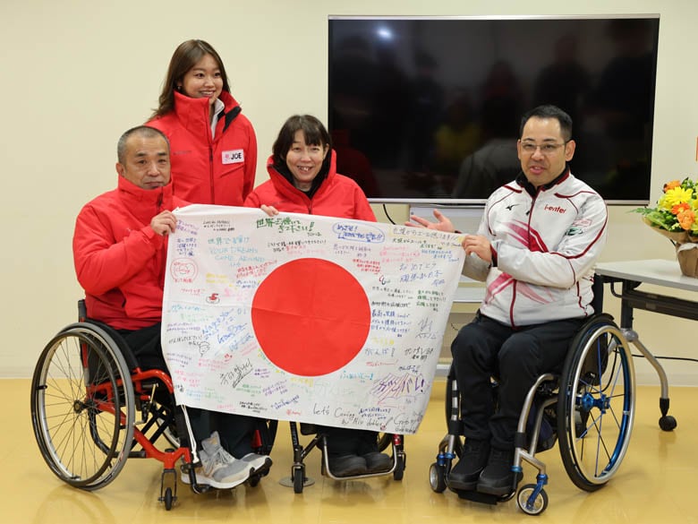 KiT CURLING CLUBの柏原一大が「カーリングを始めたときから尊敬の念を抱き、2人の背中を追いかけてきた」という2人に応援メッセージ入りの日の丸を贈り、「(2人が4人制代表として出場したバンクーバーパラリンピックから)世界の中島が復活ということで、体調を崩さないで頑張ってください。そうしないと(オルタネートである)僕たちが行くことになってしまうので」とスピーチし、参加者たちはどっと沸いた。