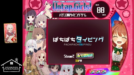 パチンコの「ST」のシステムをモチーフとし、36%の抽選を4回(=83.2%当選)の当選でボーナスを獲得、そのボーナスの時間内でタイピングを行う、というループでハイスコアを目指すゲーム性です。完全実力勝負となりがちなタイピングゲームに、誰でも勝てる可能性を付加したタイトルです。Steamリーダーボードや実績に対応し、オンラインでのスコアアタックをお楽しみいただけます。