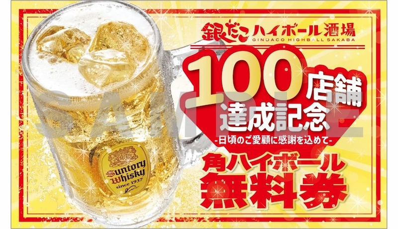 なんと、今回オープンする「JR西宮駅前店」をもって、「銀だこハイボール酒場」ブランドが全国100店舗を達成! これを記念し、12月16日(火)の一日かぎりで「全国100店舗達成記念キャンペーン」が実施されます。