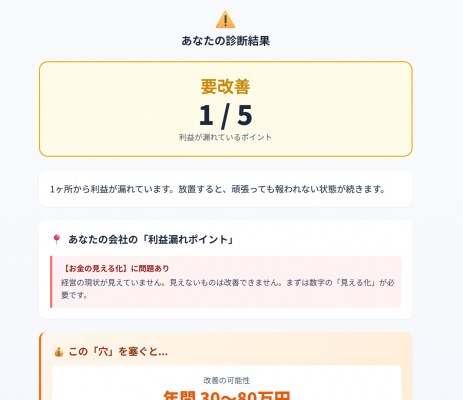 決算書や税務申告では見えにくい「お金が漏れている構造」を整理できるよう設計。数字が苦手な経営者でも直感的に状況がわかるよう、専門用語を使わずに構成しました。