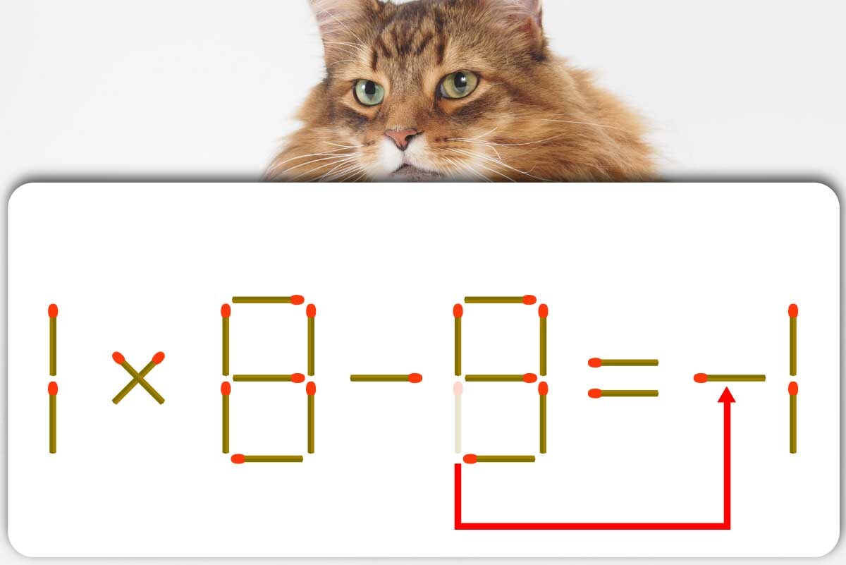 「9」のマッチ棒を1本「=」の後ろに移動させて「-」を作り、「1×8-9=-1」にする。※解答は複数ある場合があります。