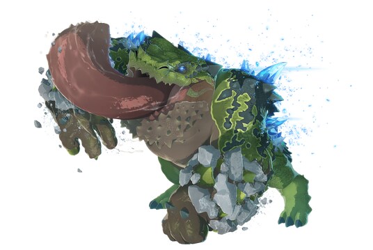 粘着性の唾液によって前脚に鉱石等を付着させ、自身を強化する性質から別名「纏蛙」とも呼ばれている。発達した前脚には、粘着性の唾液を保持する構造が備わっており、興奮時には、地面に擦り付けることで石や土砂を付着し、攻撃範囲と破壊力を増大させる。