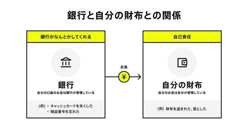 Web3のウォレットを理解するには、私たちが慣れ親しんでいるWeb2の世界における「銀行」と「自分の財布」の関係から考えてみると分かりやすいですよ。