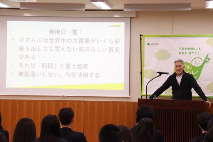 「皆さんには、世界中の大富豪が大金を積んでも買えない素晴らしい資産を持っています。それは『時間』という資産です。これからまだまだたくさんの、色々なことを試して失敗し、それを失敗体験として糧にし成功に導く、そんな時間を持っているんです。ぜひ皆さんは時間を有効活用していってほしいと思います。」