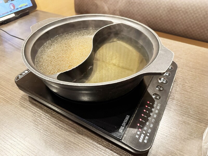 しゃぶ葉には魅力的な鍋のだしが複数用意されているが、カニを100本以上食べたいなら「白だし」「鶏がら醤油だし」にしするべし。カニには塩味がついており、その塩味だけでじゅうぶん美味しく食べられる。