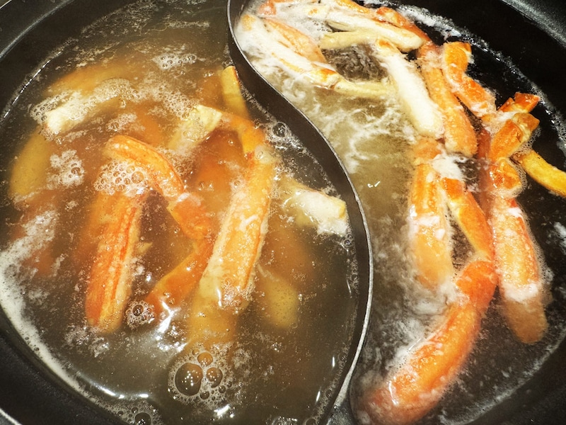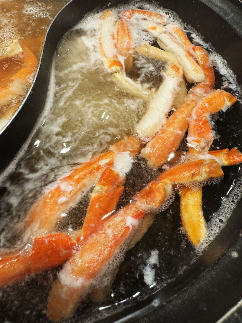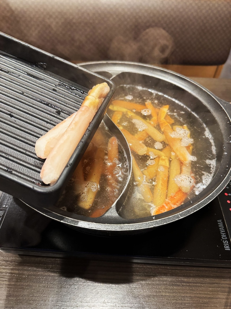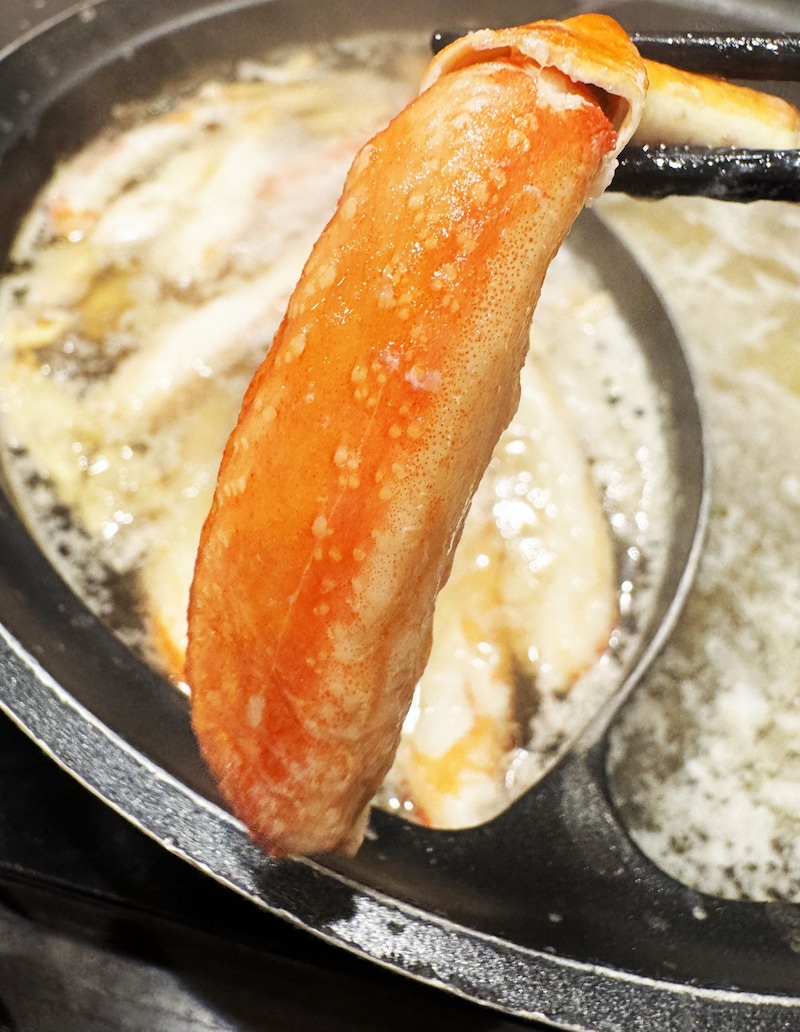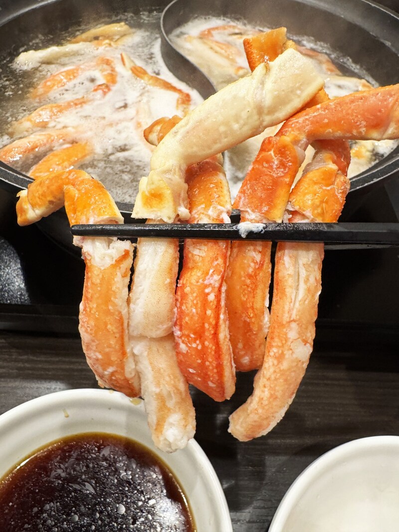 カニをオーダーしたら、皿に盛られているカニを一気に鍋に投入。冷凍されているカニの場合は加熱に時間がかかるが、そこは重要ではない。しゃぶ葉のカニ、かなり上質なので、一気に4~5本ガッツリ食べると、大量のカニの旨味を堪能できるのである。つまり濃い旨味が得られるのだ。