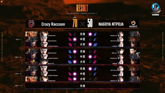 運命の大将戦、「Crazy Raccoon」のリーダー「どぐら選手」に対して、「名古屋NTPOJA」は今シーズン躍進を見せる「もっちー選手」を送り出した。