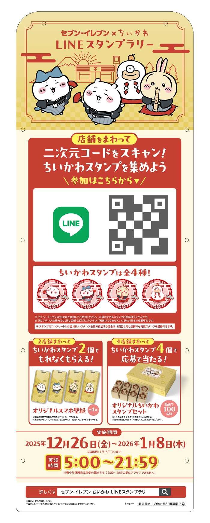 12月26日(金)〜1月8日(木)には、初開催のちいかわLINEスタンプラリーを実施。店内POPの二次元コードを読み取ってスタンプを集めると、スマホ壁紙やオリジナルスタンプセットが当たるチャンスも。