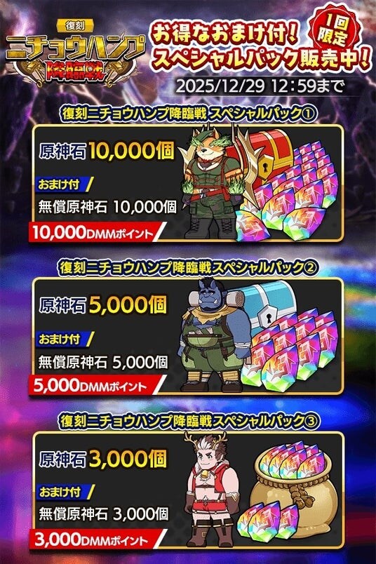 「復刻 ニチョウハンプ降臨戦」開催、「九十九 哮介 IF」の登場を記念して原神石に加え、育成素材が入手できてお得な「降臨戦「九十九 哮介 IF」育成促進パック」と、「復刻ニチョウハンプ降臨戦スペシャルパック」も3種登場!こちらも是非お見逃しなく!