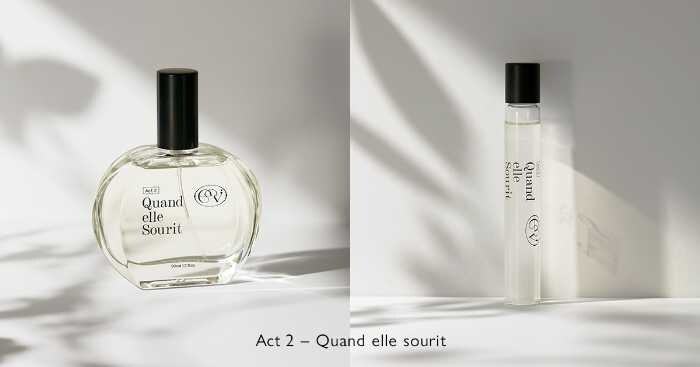 Act2「Quandellesourit|咲きし音」は、クローブのスパイスにローズとピオニーが重なり、ムスクとウッディが柔らかく残るフローラルフルーティ。