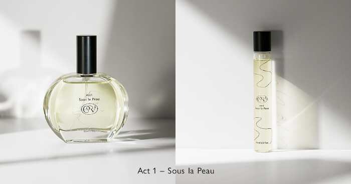 Act1「Souslapeau|肌の余韻」は、カシスの透明感からローズとゼラニウムが広がり、オークモスとアンバーが静かに寄り添うフローラルウッディスパイシー。
