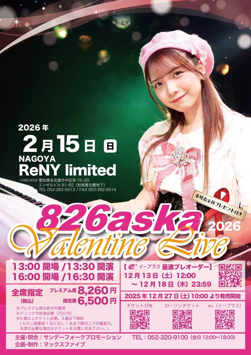 エレクトーン奏者・826aska(はちにいろくあすか)が、2026年2月15日(日)に、大好評の恒例公演 「Valentine Live」を名古屋ReNY limitedにて開催することが決定した。毎年多くのファンが心待ちにしている本公演では、来場者全員へのプレゼントも予定されている。