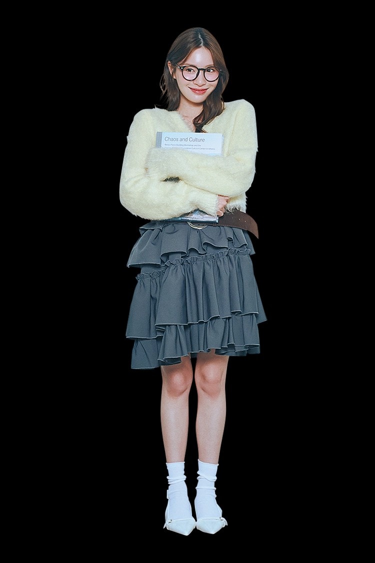 イエローニットカーディガンとあわせてスカートとして活用!メガネで優等生っぽく仕上げて♡