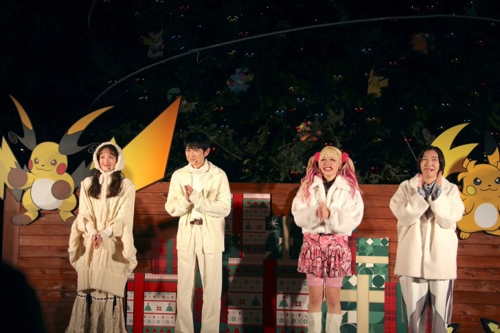 サンタクロース衣装のピカチュウとともに「ピカピカ放電ツリー」に灯りが入ると、会場の空気は一気にホリデームードへと切り替わる。赤レンガの建物と冬の夜景、その中心で光るツリーは、この日から始まる特別な時間を象徴しているようだった。