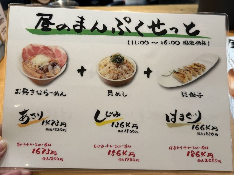 「昼のまんぷくせっと」(11:00~16:00)の提供時間だったので、「はまぐりらーめん」のまんぷくセットをオーダー。