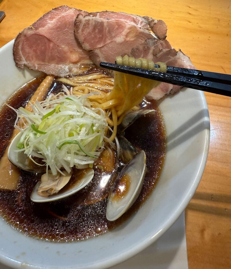 ラーメンは、店名のインパクトとは異なり、奇をてらうこともなく真っ当に貝の旨味が出ている醤油ラーメン。コクのあるスープは細めのストレート麺や薄切りのチャーシューと相性がよい。はまぐりもそれなりの数が入っており、食べ応えあり。