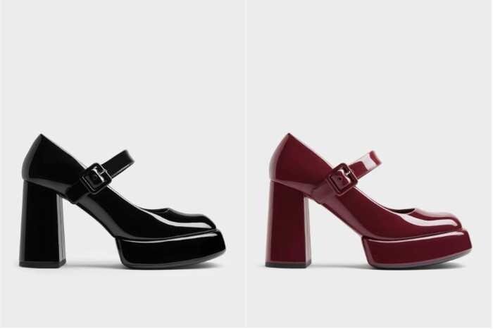 ¥10,900(税込)のパテントブロックヒールプラットフォームメリージェーンパンプスは、安定感とスタイルアップを両立します。