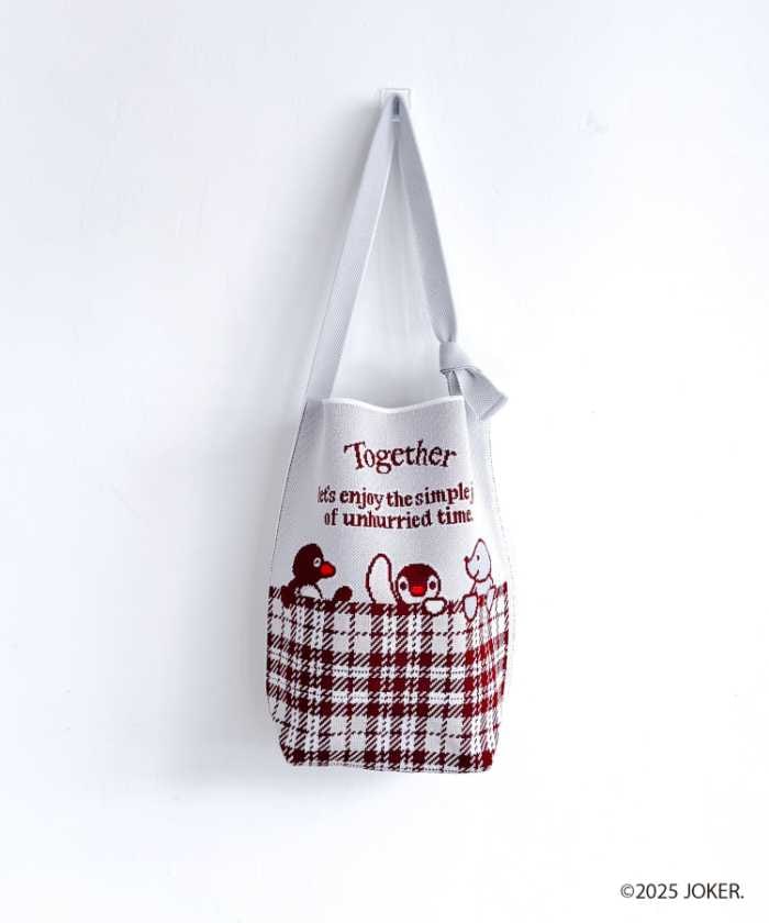 多色チェック柄から顔を出すピングーたちが印象的。マチ付きで大容量、ショルダーは長さ調整可能です。