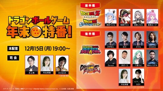 「ドラゴンボールZ KAKAROT」パートでは女性VTuberグループ「ホロライブ」に所属する、兎田ぺこら、白銀ノエル、宝鐘マリン、姫森ルーナ(敬称略)が紅白のチームに分かれてゲームに関するクイズやゲーム内のバトルを通じて激闘を繰り広げました。