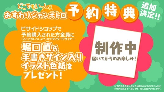 『どこでもいっしょ(TM)』おすわりジャンボトロの発売延期に伴い、ビサイドショップで予約購入された方全員に、『どこでもいっしょ(TM)』のキャラクターデザイナーである堀口直氏の手書きサイン入り複製色紙のプレゼントが決定致しました!