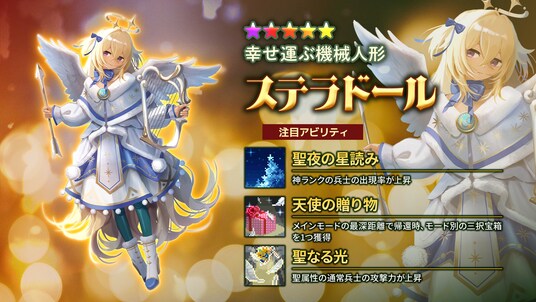 「【幸せ運ぶ機械人形】ステラドール」として再登場したアイドールは、神ランク兵士の出現率がアップするアビリティを実装。可憐な姿で出撃時の総合的な戦力をアップします。
