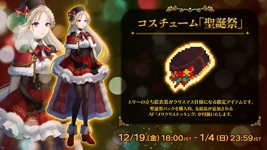 イベント開催中は、ゲームのストーリーを導くヒロイン「エリー」を、季節限定の衣装に着替えさせることが可能になります。季節限定のコスチュームはパックアイテム「コスチューム:エリー(聖誕祭)パック」を購入することで変更可能となります。