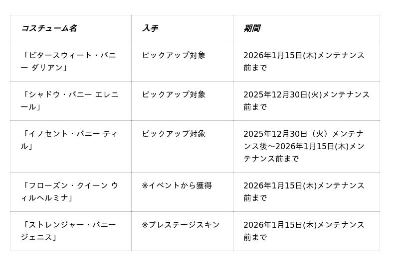 新コスチューム「ビタースウィート・バニー ダリアン」、「シャドウ・バニー エレニール」、「イノセント・バニー ティル」とそれぞれの専用装備がピックアップとなります。また、「フローズン・クイーン ウィルヘルミナ」「ストレンジャー・バニー ジェニス」が登場します。