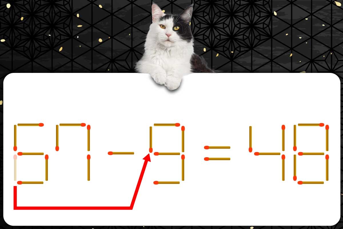 「6」のマッチ棒を1本、「3」に移動させて「9」を作り「57-9=48」にする。※解答は複数ある場合があります。