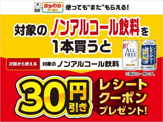 12月15日から26年1月4日までの期間、対象のノンアルコール飲料を1本購入すると、次回使える30円引きクーポンがもらえます。