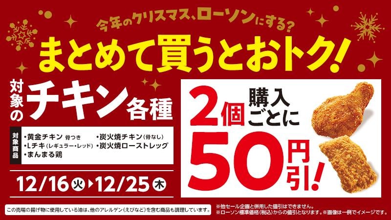 12月16日から25日までの期間、対象のチキン各種を2個購入するごとに、50円引きになります。