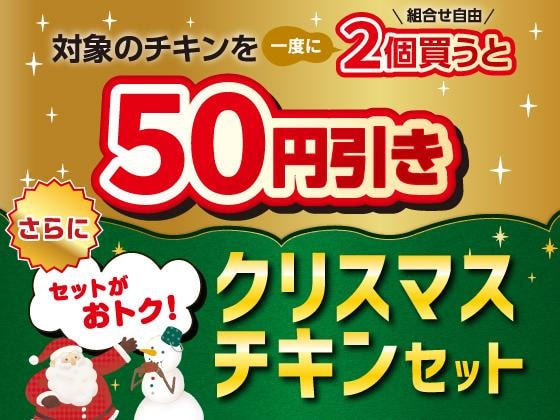 12月19日から25日までの期間、対象のチキンを一度に2個(組合せ自由)購入すると、50円引きになります(クリスマスチキンセットは対象外)。
